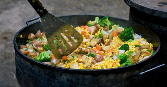 In dutch oven combine the soup and ½ cup cheese; cook and stir until cheese is melted. Stir in the vegetables, rice and ham. Sprinkle with remaining cheese and bake 25 minutes or until heated throughout. Serves 4